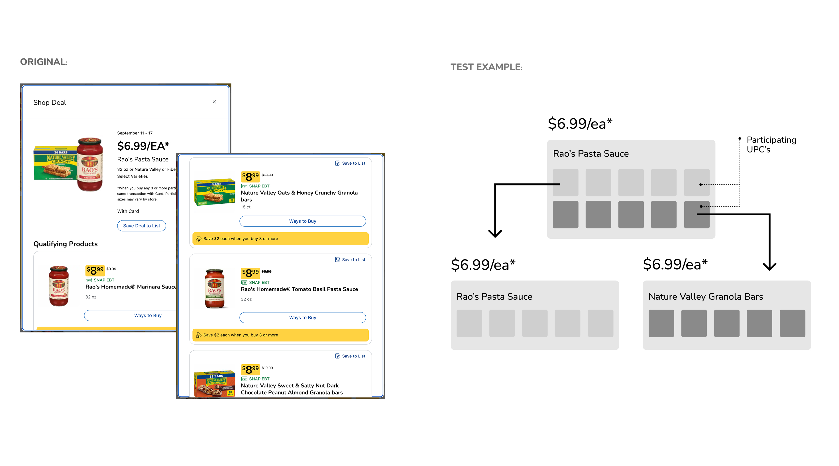 One striking example was what we jokingly called the “Beans and Lemonade Problem” — promotions grouping completely unrelated items (like pasta sauce and granola bars) under a single “buy two or more for $6.99” deal. This approach forced customers to navigate retailer logic instead of their own shopping logic.