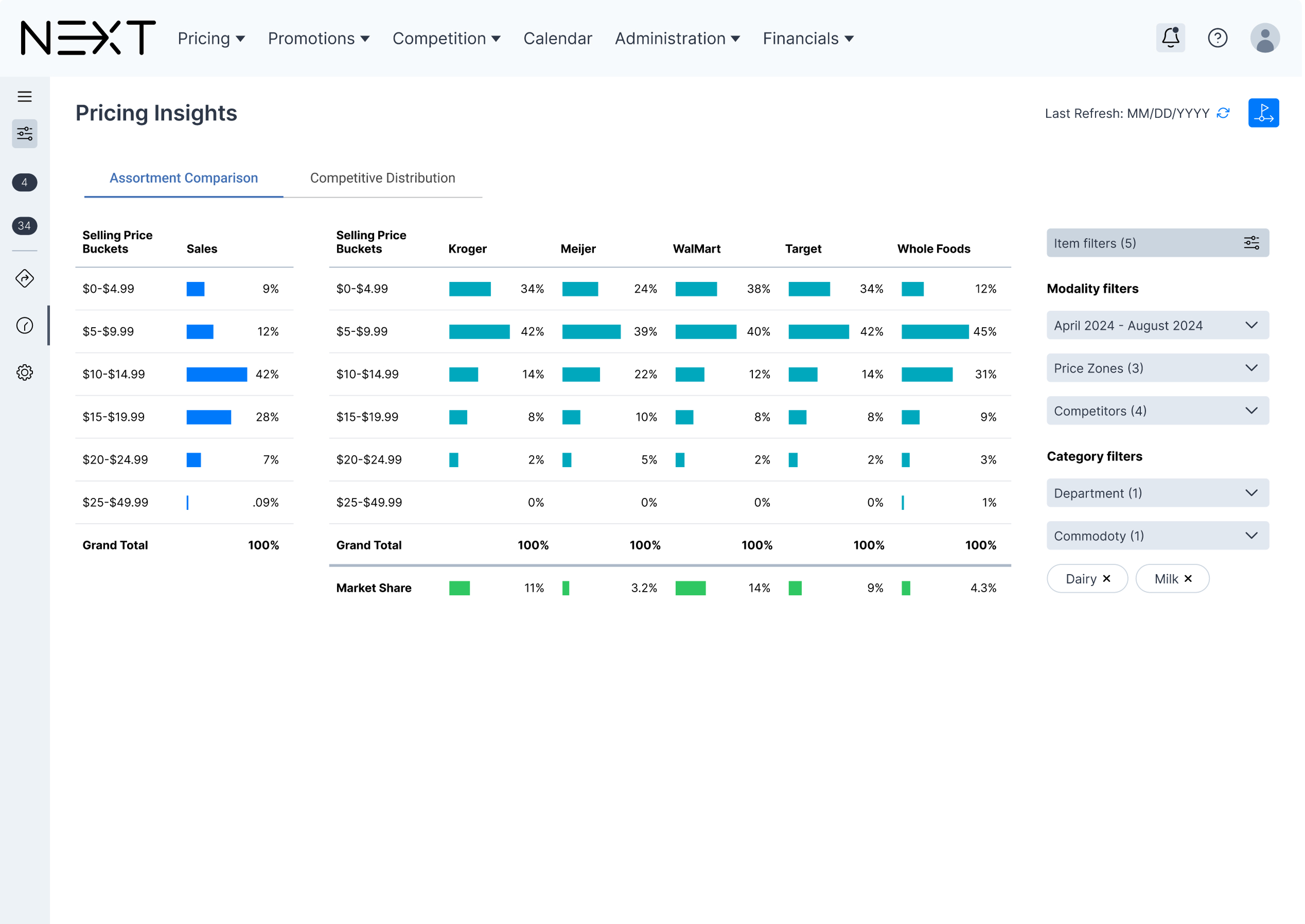 The third element is an insights dashboard aggregates data for groups of items so analysts can see a rollup of how groups of items compare across stores. Users can click through various data visualizations to see full category or program performance across competitors to not only see individual item performance but to analyze the entire basket cost comparisons over time. Analysts can use this information to share with category managers to help inform the category strategy or make adjustments to category goals.
