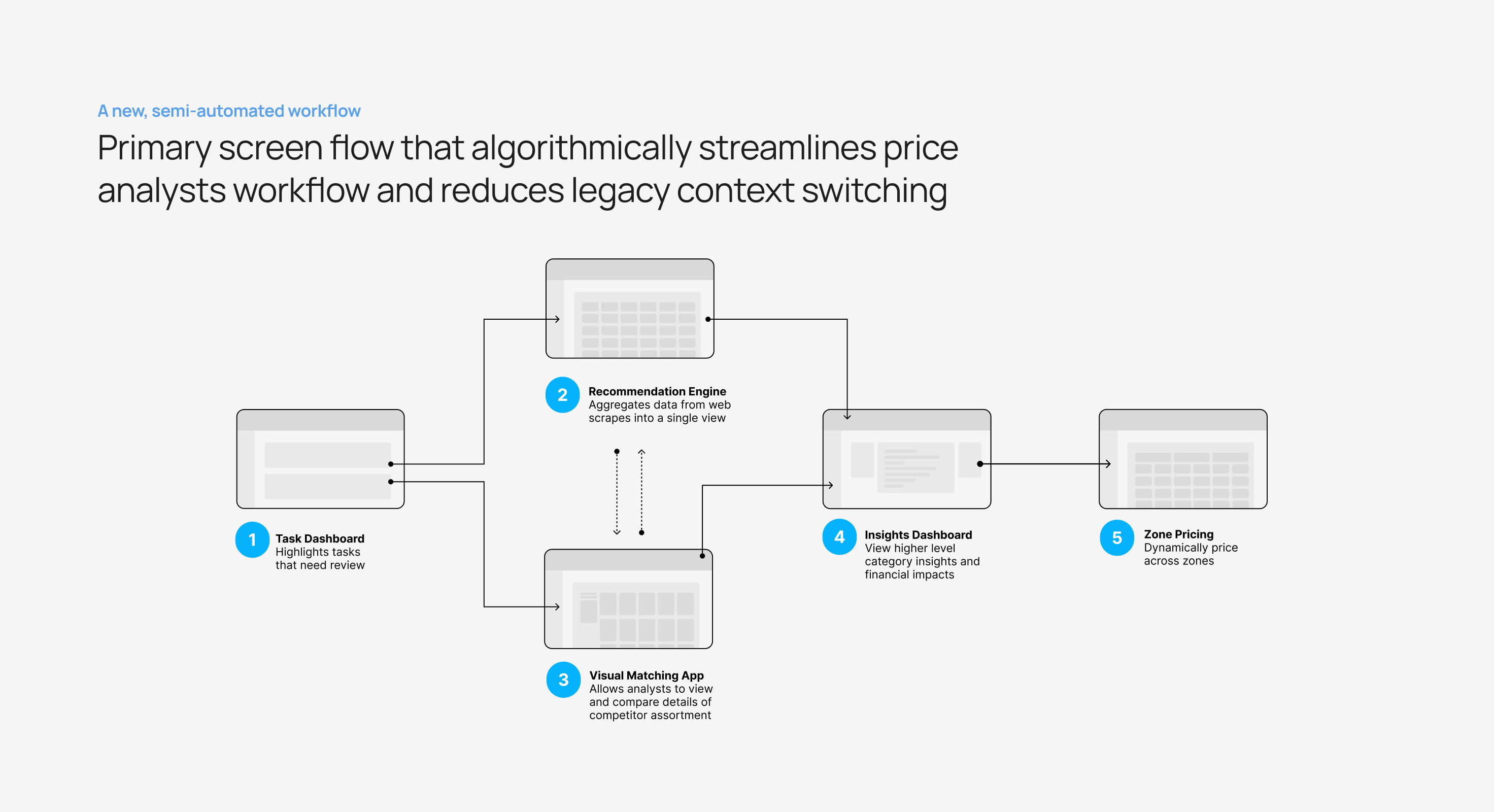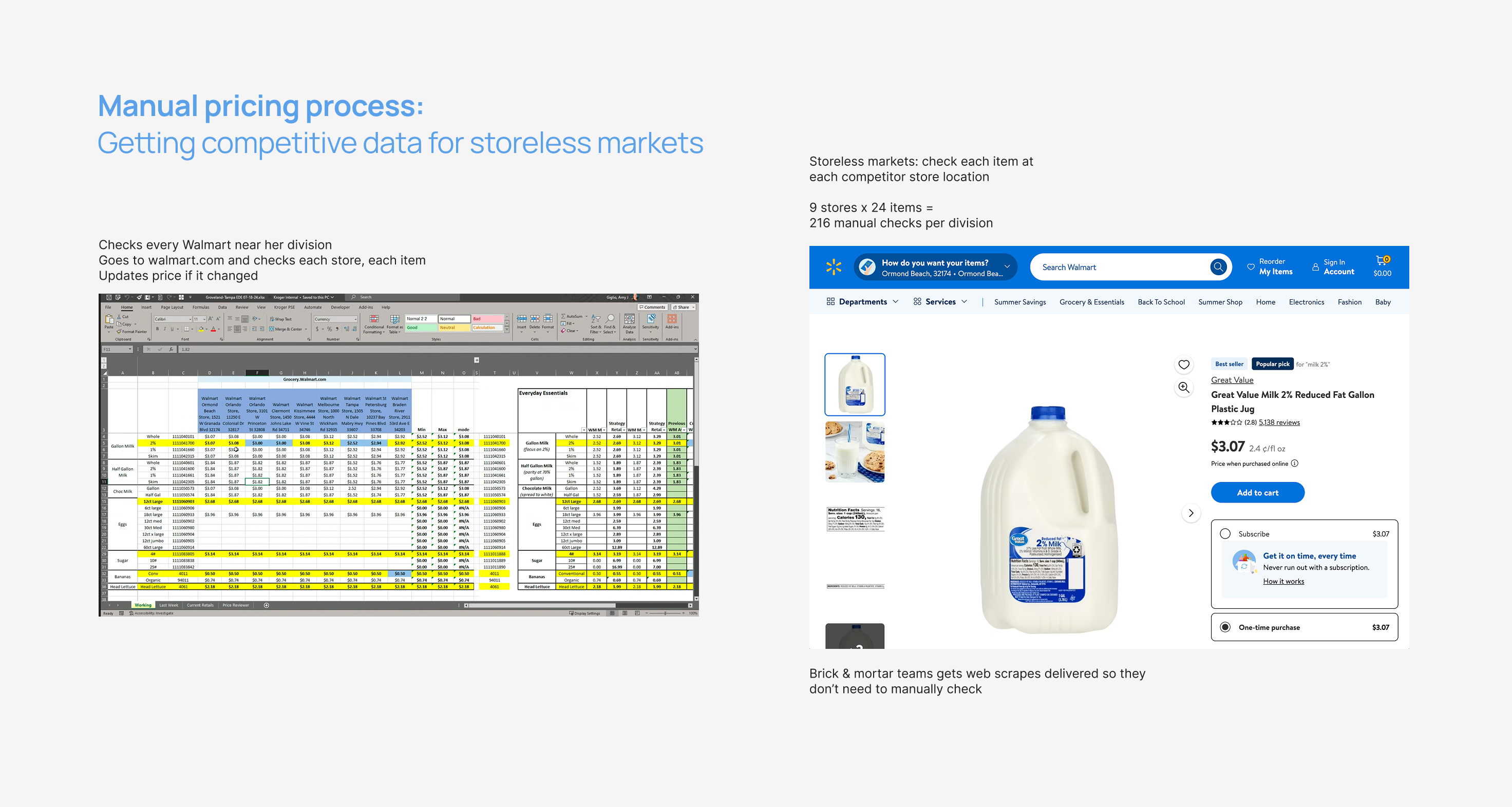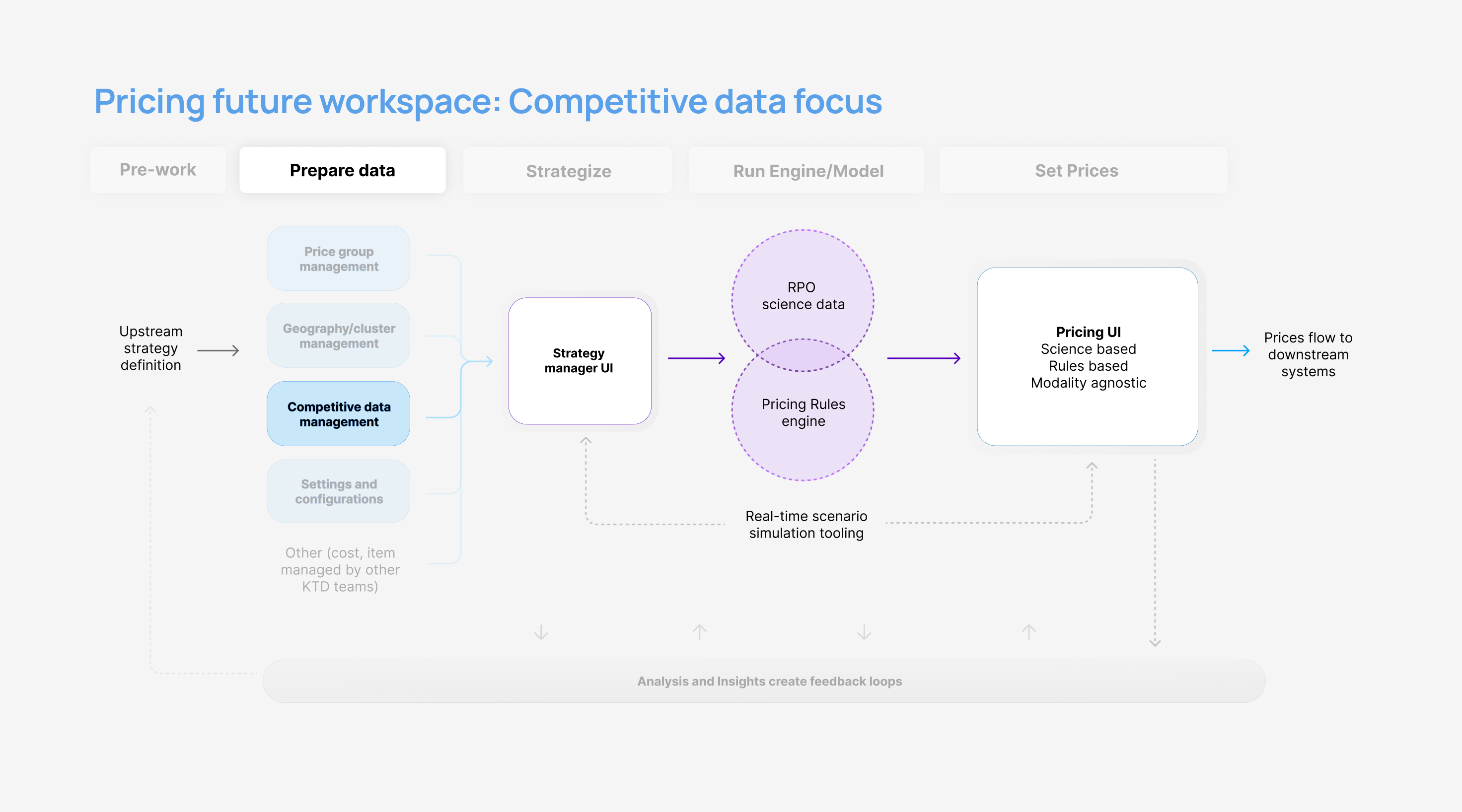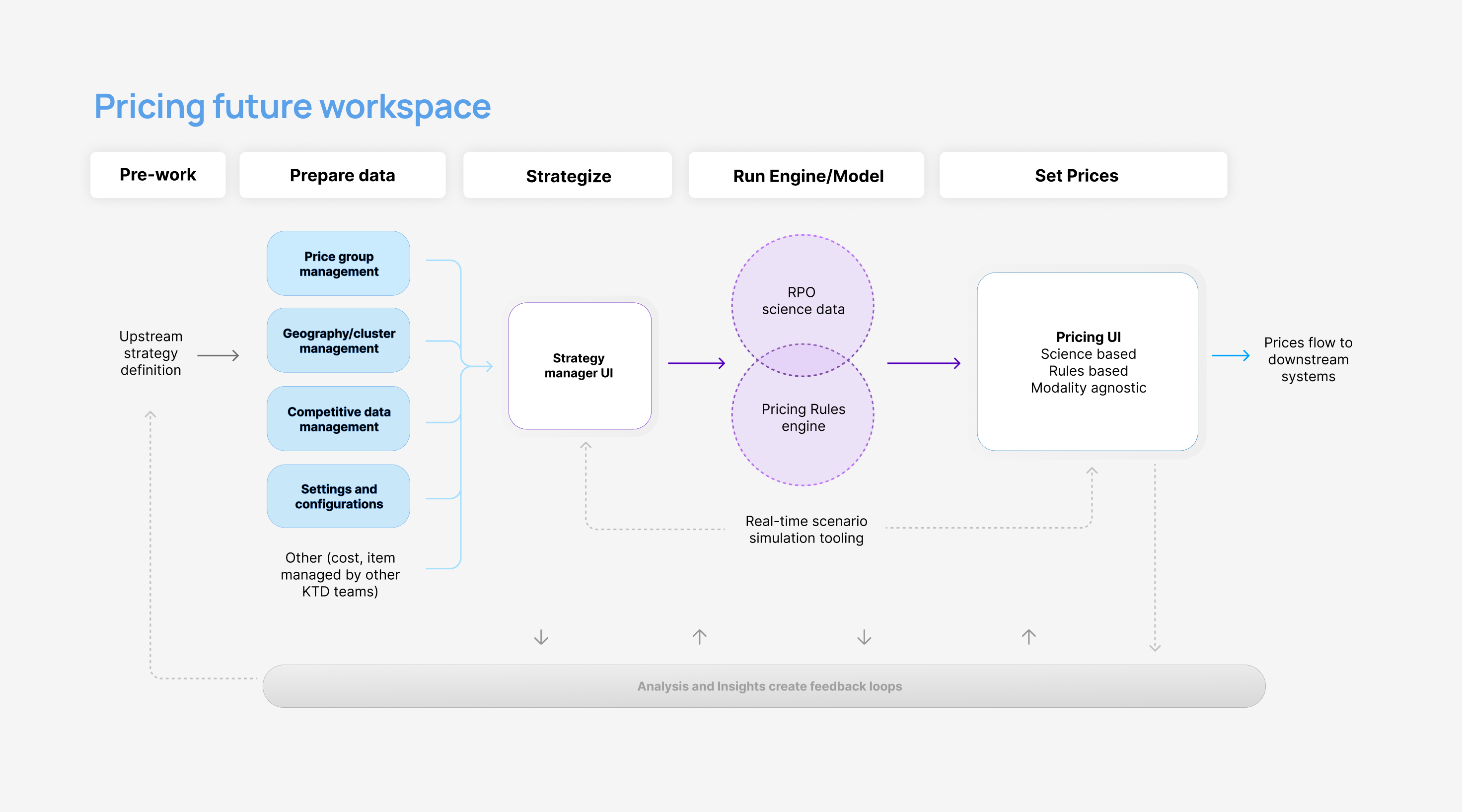 The current pricing process was fragmented and labor-intensive. Division pricing analysts manually gathered competitive data from stores weekly—often checking hundreds of prices via spreadsheets. This was followed by macro-based Excel analysis, manual price adjustments, and overnight batch processing in legacy systems. Despite Kroger’s scale, much of its $100B pricing operation still depended on repetitive manual work and disconnected tools.